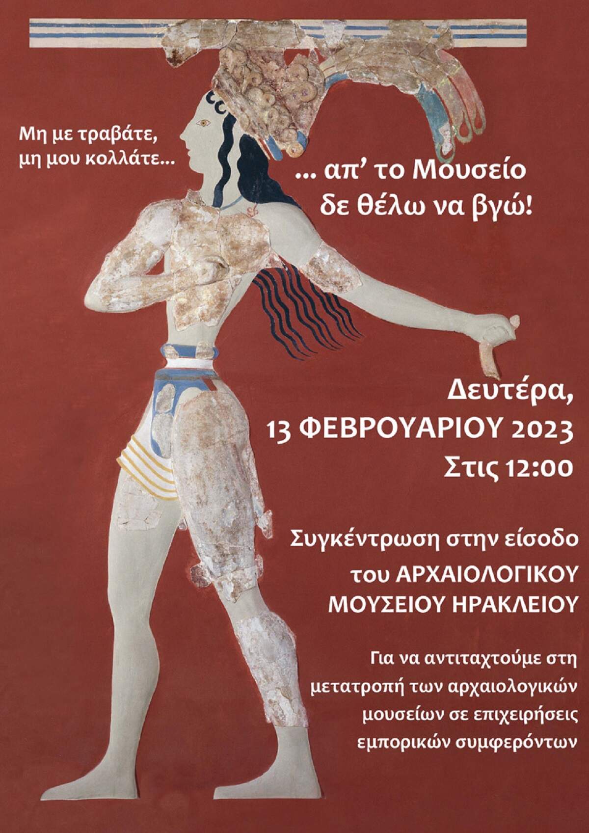 Η Παγκρήτια Ένωση Πτυχιούχων Αρχαιοφυλάκων έχει προκηρύξει δίωρη στάση εργασίας για τα μέλη του Συλλόγου της που εργάζονται στο Αρχαιολογικό Μουσείο Ηρακλείου, τη Δευτέρα 13/02/2023, από τις 8:30, ημέρα ψήφισης του νομοσχεδίου, που έχει καταθέσει η Υπουργός Πολιτισμού και Αθλητισμού και αφορά τη μετατροπή 5 μεγάλων Μουσείων σε Νομικά Πρόσωπα Δημοσίου Δικαίου (ΝΠΔΔ). Την ίδια ημέρα έχει εξαγγελθεί 24ωρη απεργία από την ΠΟΕ- ΥΠΠΟ και το μουσείο θα παραμείνει κλειστό. Ο Σύλλογος ζητά επιτακτικά, έστω και τώρα, την άμεση απόσυρση του νομοσχεδίου – ντροπή, που εμπορευματοποιεί την πολιτιστική κληρονομιά και «νομιμοποιεί» την εξαγωγή των αρχαιοτήτων μας, απευθύνοντας κάλεσμα κοινής και συλλογικής αντιδρασης σε όλους τους Ηρακλειώτες και τις Ηρακλειώτισσες.