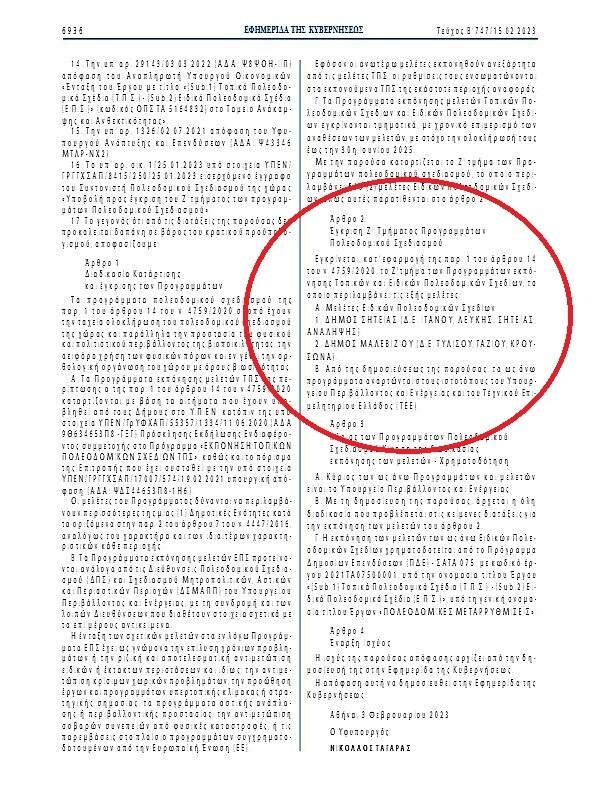 Ένα ολοκληρωμένο σχέδιο χωρικής οργάνωσης και ανάπτυξης, με χρήσεις γης και όρους δόμησης αλλά και θωράκισή του από φυσικές καταστροφές στο σύνολο της εδαφικής του έκτασης θα αποκτήσει ο Δήμος Μαλεβιζίου με την εκπόνηση Ειδικού Πολεοδομικού Σχεδίου από το Υπουργείο Περιβάλλοντος και Ενέργειας. Η απόφαση για την εκπόνηση του δημοσιεύτηκε σε ΦΕΚ ανοίγοντας το δρόμο για την ανάθεση των μελετών.
