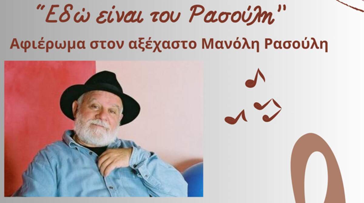 «Εδώ είναι του Ρασούλη» η συναυλία, αφιέρωμα στον σπουδαίο δημιουργό Μανώλη Ρασούλη με τους τους Πέτρο Βαγιόπουλο, Λιζέτα Καλημέρη, Θάνο Ματζίλη, Κωνσταντίνο Στεφανή και Ναταλία Ρασούλη, η όποια παρουσιάστηκε στην Πλατεία Ελευθερίας στο πλαίσιο του Φεστιβάλ «Τέχνη Καθ’ Οδόν» είναι πλέον διαθέσιμη στο κανάλι του πολιτισμού Δήμου Ηρακλείου, Heraklion Arts and Culture