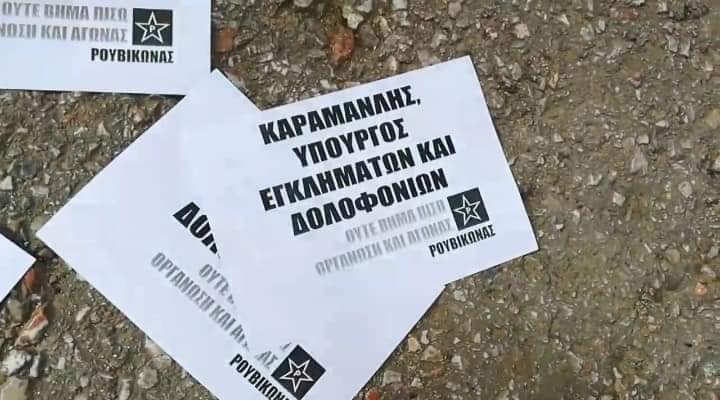 Παρέμβαση με τρικάκια και συνθήματα έξω από το σπίτι του πρώην υπουργού Υποδομών και Μεταφορών, Κώστα Καραμανλή, στην περιοχή της Πλάκας, πραγματοποίησαν, σήμερα το μεσημέρι, μέλη του Ρουβίκωνα, για το έγκλημα στα Τέμπη.