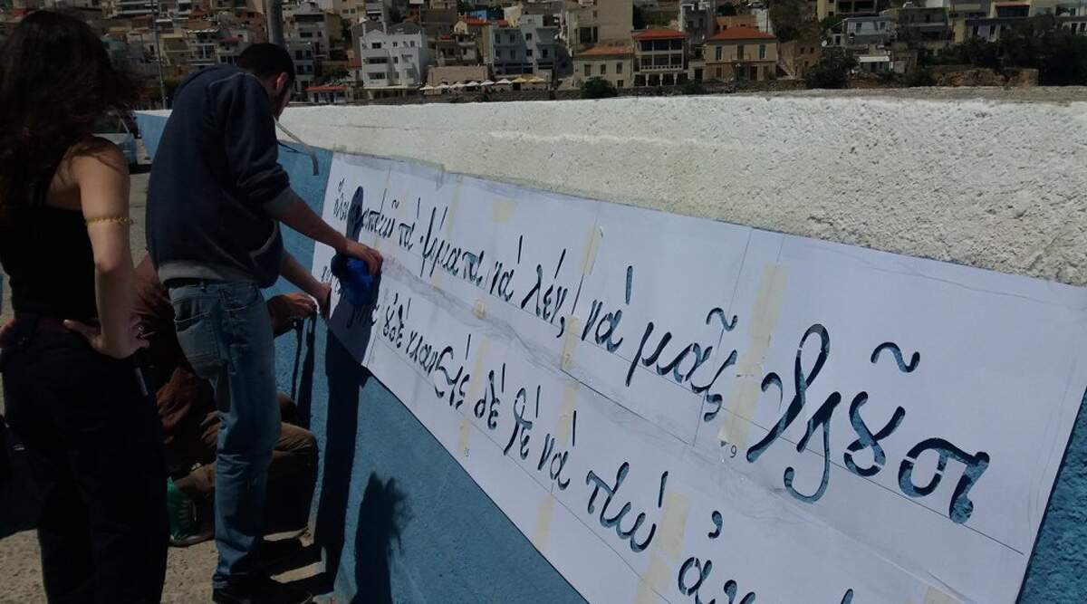 Ο Δρ. Γιώργος Ματθιόπουλος, καθηγητής και καλλιτεχνικός υπεύθυνος του εγχειρήματος, παραχώρησε στη Στέγη Β.Κ. το σχετικό πληροφοριακό υλικό, κείμενο και εικόνες, τα οποία ακολουθούν στην παρούσα σελίδα. Ακόμα, η Στέγη Β.Κ. έχει στη διάθεσή της ένα ψηφιακό φάκελο με σχέδια από δίστιχα του Ερωτόκριτου στη γραμματοσειρά Grecs du roi και τον οδηγό εφαρμογής των γραμμάτων-στένσιλ, ο οποίος μπορεί να αποσταλεί, κατόπιν τηλεφωνικής ή ηλεκτρονικής επικοινωνίας με τη Στέγη Β.Κ., σε όποια σχολική ή άλλη εκπαιδευτική ομάδα επιθυμεί να υλοποιήσει τη σχετική δράση.”