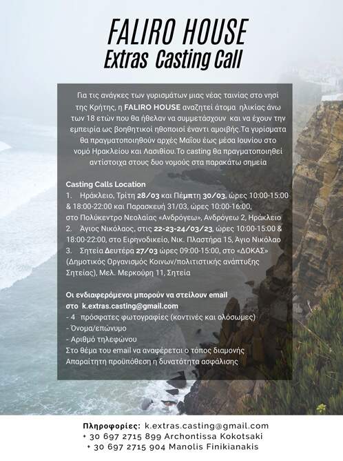 Πρόσκληση σε άτομα που ενδιαφέρονται να συμμετάσχουν ως βοηθητικοί ηθοποιοί (κομπάρσοι) στη νέα ταινία της Faliro house, που θα γυριστεί σε Ηράκλειο και Λασίθι απευθύνει μέσω ανακοίνωσής της η εταιρία.