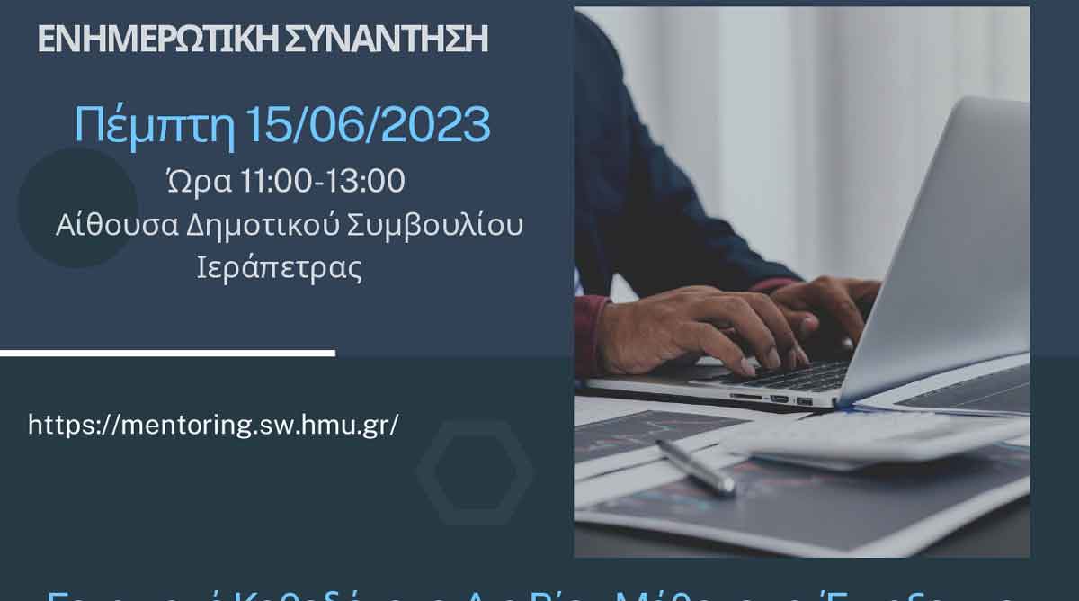 Την Τρίτη, 4 Απριλίου 2023 και ώρα 6:00-8:00μ.μ, σε συνεργασία με τον Δήμο Ηρακλείου, πρόκειται να πραγματοποιηθεί δια ζώσης η επόμενη ενημερωτική συνάντηση στην αίθουσα «Καστελλάκη» του Επιμελητηρίου Ηρακλείου, στην οποία καλούνται εργοδότες αλλά και ιδιώτες να ενημερωθούν για τις ωφέλειες που μπορούν να λάβουν από την πλατφόρμα Mentoring. Είσοδος ελεύθερη.