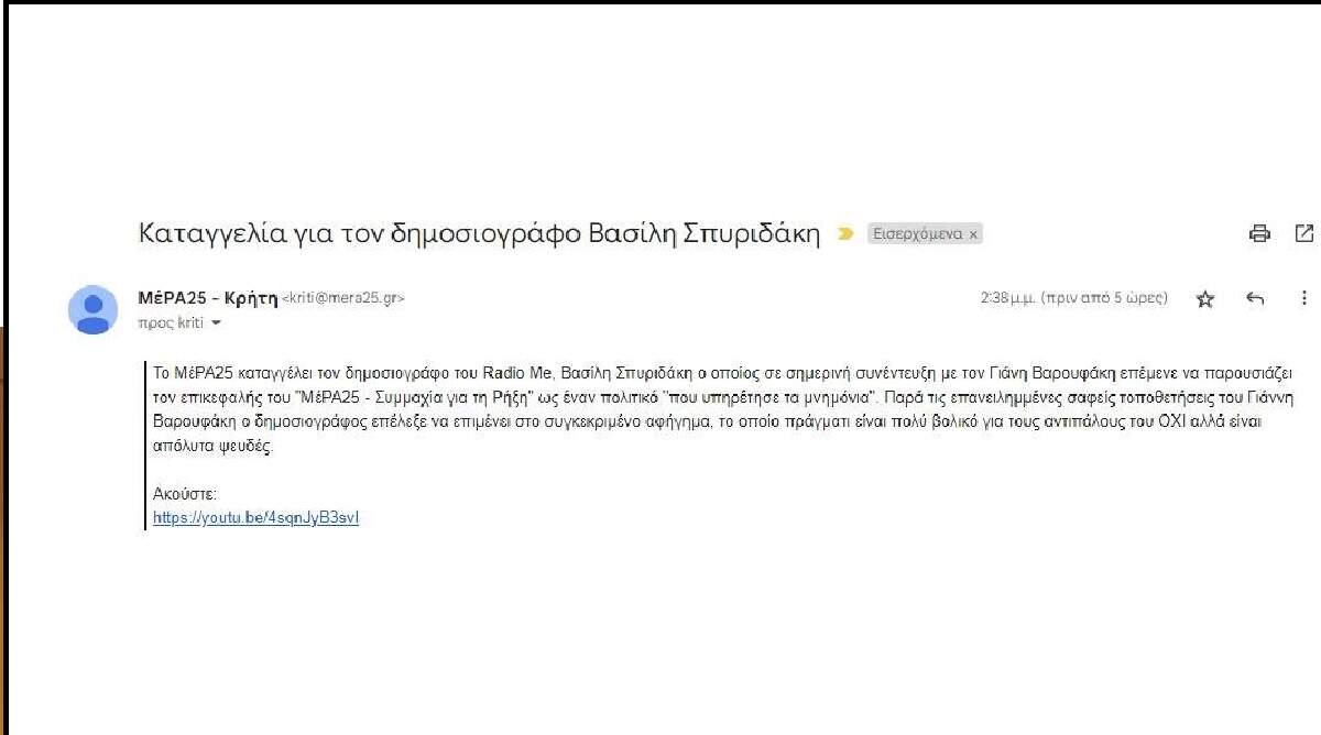 Τη στοχοποίηση του δημοσιογράφου του Ηρακλείου, Βασίλη Σπυριδάκη από το ΜΕΡΑ25 επειδή δεν άρεσαν οι ερωτήσεις του (!) στο κόμμα και το γραμματέα του Γιάνη Βαρουφάκη, καταγγέλλει η Ένωση Συντακτών Πελοποννήσου, Ηπείρου και Νήσων. Την άθλια στοχοποίηση είχε καταγγείλει αμέσως το Candiadoc.gr.