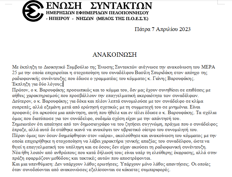 Με έκπληξη το Διοικητικό Συμβούλιο της Ένωσης Συντακτών ανέγνωσε την ανακοίνωση του ΜΕΡΑ 25 με την οποία επιχειρείται η στοχοποίηση του συναδέλφου Βασίλη Σπυριδάκη στον απόηχο της ραδιοφωνικής συνέντευξης που έδωσε ο γραμματέας του κόμματος κ. Γιάνης Βαρουφάκης.