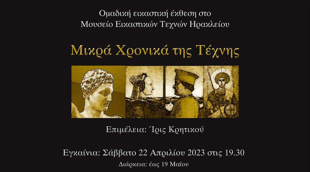Eγκαινιάζεται το Σάββατο 22 Απριλίου στις 19.30 η ομαδική εικαστική έκθεση «Μικρά Χρονικά της Τέχνης» με την επιμέλεια της Ίριδας Κριτικού στο Μουσείο Εικαστικών Τεχνών Ηρακλείου (Νυμφών 3).