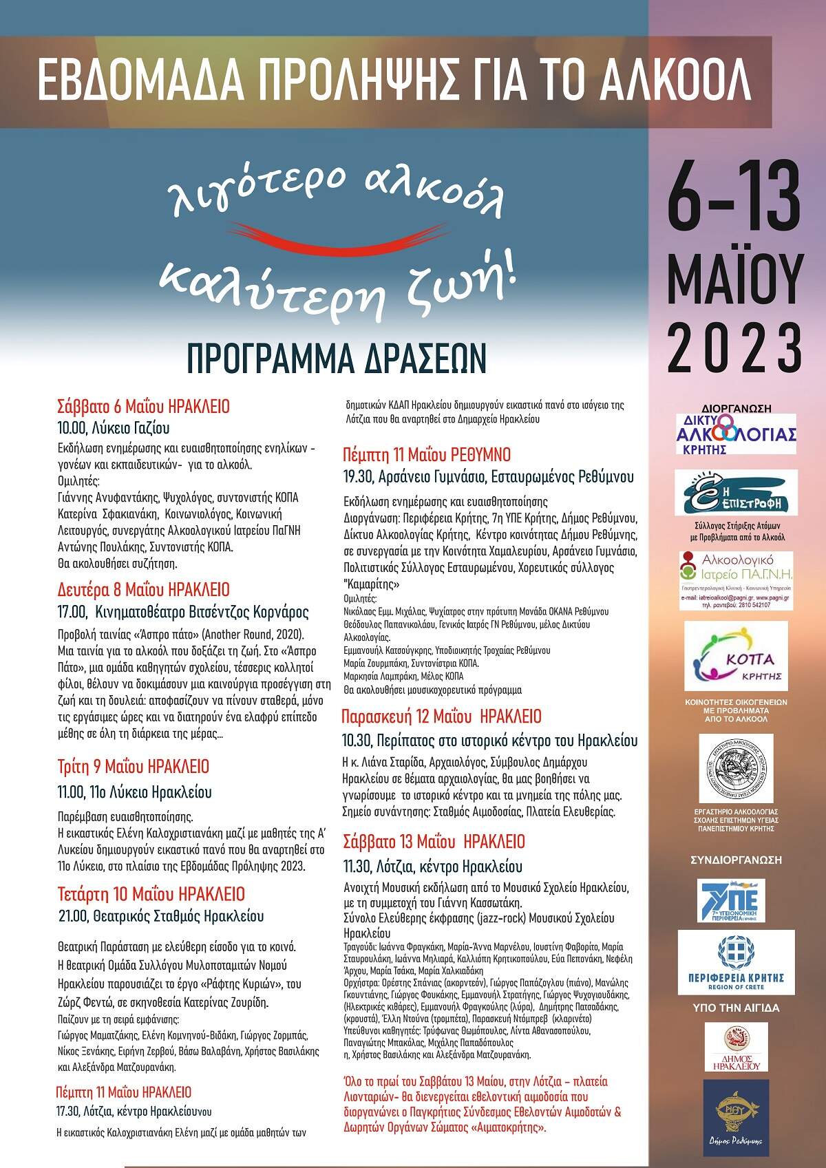 Η 7η Υγειονομική Περιφέρεια Κρήτης, το Δίκτυο Αλκοολογίας Κρήτης, το Αλκοολογικό Ιατρείο ΠαΓΝΗ , οι Κοινότητες Οικογενειών με Προβλήματα από το Αλκοόλ-ΚΟΠΑ Κρήτης ,το Εργαστήριο Αλκοολογίας της Ιατρικής Σχολής του Πανεπιστημίου Κρήτης, ο Σύλλογος Στήριξης Ατόμων με Προβλήματα από το Αλκοόλ «Η Επιστροφή» σε συνδιοργάνωση με την Περιφέρεια Κρήτης υλοποιεί σειρά εκδηλώσεων ενημέρωσης και ευαισθητοποίησης των πολιτών για τις επιπτώσεις της προβληματικής κατανάλωσης αλκοόλ.