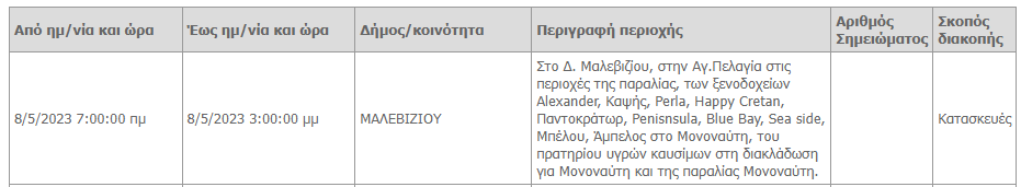 Σήμερα Δευτέρα τα ίδια. Αλλά οι διακοπές σταμάτησαν μετά τις5 το απόγευμα, αν και το πρόγραμμα ανέφερε ότι θα ήταν μέχρι τις 3 μμ, όπως φαίνεται στο απόσπασμα από την ανάρτηση στη σελίδα της ΔΕΗ.