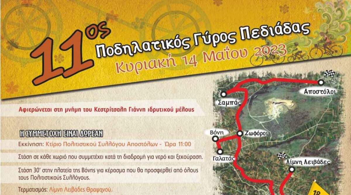 Οι πολιτιστικοί σύλλογοι Αποστόλων, Σαμπά, Ζωφόρων, Βόνης, Γαλατά και Θραψανού συνδιοργανώνουν με την Περιφέρεια Κρήτης τον «11ο ποδηλατικό γύρο Πεδιάδας». Η διοργάνωση θα πραγματοποιηθεί την Κυριακή 14 Μαΐου και στηρίζεται από το Υπουργείο Πολιτισμού Αθλητισμού και το δήμο Μινώα Πεδιάδας.