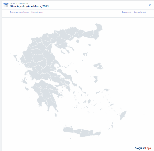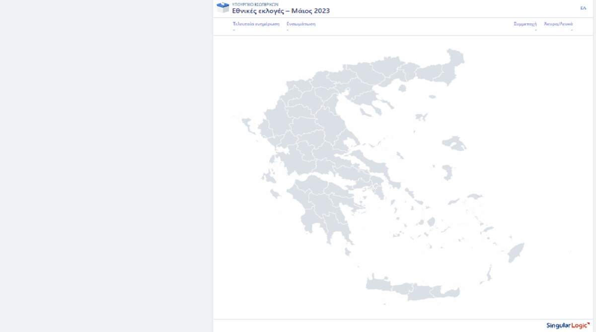 Η Singular Logic έδωσε στο υπουργείο Εσωτερικών την πλατφόρμα όπου θα αναρτώνται σε πραγματικό χρόνο τα αποτελέσματα των εκλογών 2023 στις 21 Μαΐου. Στην ιστοσελίδα του ΥΠΕΣ έχει ήδη «ανοίξει» ο χάρτης, πάνω στον οποίο θα μπορείτε να βλέπετε πώς διαμορφώνεται το εκλογικό αποτέλεσμα.