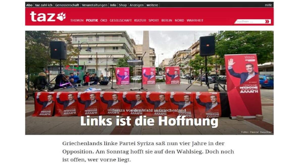 Ο απολογισμός τη κυβέρνησης Μητσοτάκη «δεν είναι θετικός» τονίζει η εφημερίδα TAZ η οποία με άρθρο της δύο ημέρες πριν από τις εκλογές στην Ελλάδα ξεκαθαρίζει ότι «η ελπίδα είναι στην Αριστερά».