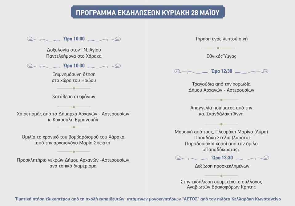 Θα απευθύνει χαιρετισμό ο κ. Αριστομένης Συγγελάκης πανεπιστημιακός και συγγραματέας του Εθνικού Συμβουλίου Διεκδίκησης Των Γερμανικών Οφειλών. Ο εορτασμός της 82ης επετείου της Μάχης της Κρήτης θα πραγματοποιηθεί στο χώρο του Μνημείου Ηρώων στο Χάρακα.