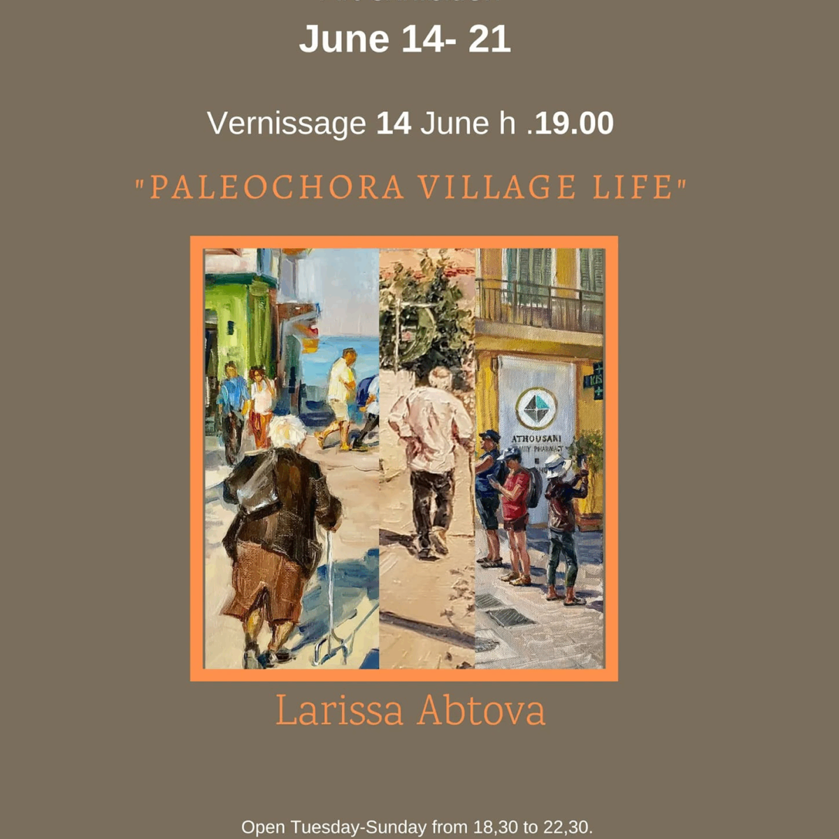 Για δεύτερη φορά στην γκαλερί Art Flow Studio Gallery, στην Παλαιόχωρα, η Λάρισα παρουσιάζει μια θεματική εικαστική έκθεση, αφιερωμένη όλη στο μικρό κρητικό χωριό, την Παλαιόχωρα Χανίων, από 14 έως 21 Ιουνίου.