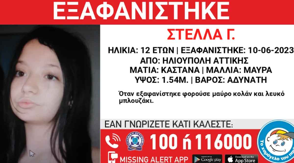 Στην σχετική ανακοίνωση για την εξαφάνιση της 12χρονης το Χαμόγελο του Παιδιού αναφέρει πως «Στις 10/6/2023, μεσημβρινές ώρες εξαφανίστηκε από την περιοχή της Ηλιούπολης Αττικής, η Στέλλα Γ., 12 ετών. Το «Χαμόγελο του Παιδιού» ενημερώθηκε για την εξαφάνιση και προχώρησε στη δημοσιοποίηση των στοιχείων της ανήλικης σήμερα 10/06/2023, κατόπιν αιτήματος της οικογένειας της, καθώς ενδέχεται να συντρέχουν λόγοι οι οποίοι θέτουν τη ζωή της σε κίνδυνο.