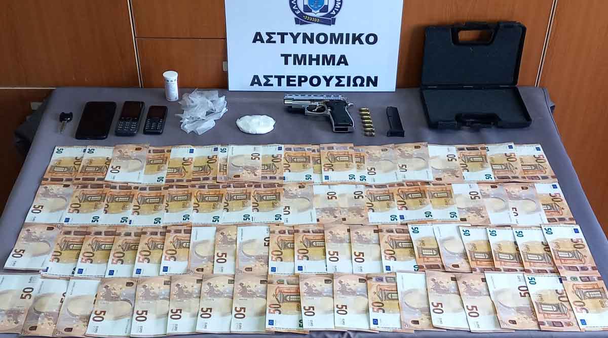 Όπως αναφέρεται στη σχετική ανακοίνωση, σε έρευνες στο αυτοκίνητο και την οικία του βρέθηκαν και κατασχέθηκαν 50 γραμμάρια κοκαΐνης και πιστόλι με γεμιστήρα και φυσίγγια. Επιπλέον, κατασχέθηκαν 3.750 ευρώ.