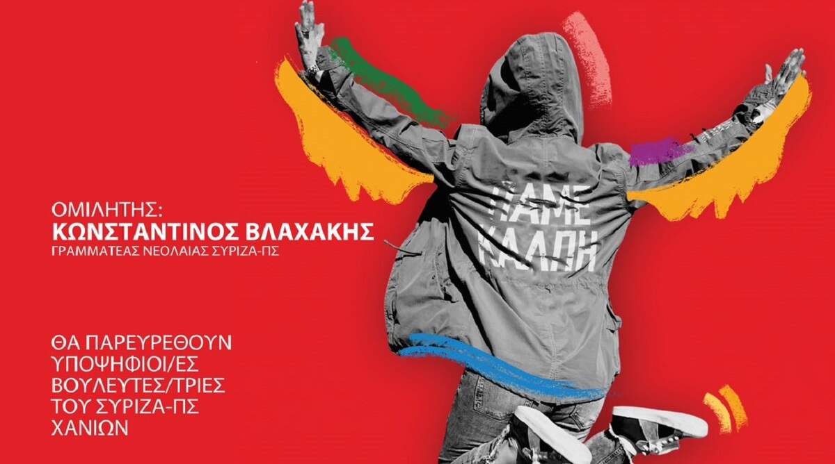 Η Νεολαία ΣΥΡΙΖΑ Π.Σ. Χανίων στο πλαίσιο της προεκλογικής περιόδου, διοργανώνει την Τετάρτη 21/06/2023 και ώρα 8.00 το βράδυ ανοιχτή εκδήλωση – συζήτηση με τον Γραμματέα της Νεολαίας ΣΥΡΙΖΑ Π.Σ. Κωνσταντίνο Βλαχάκη.