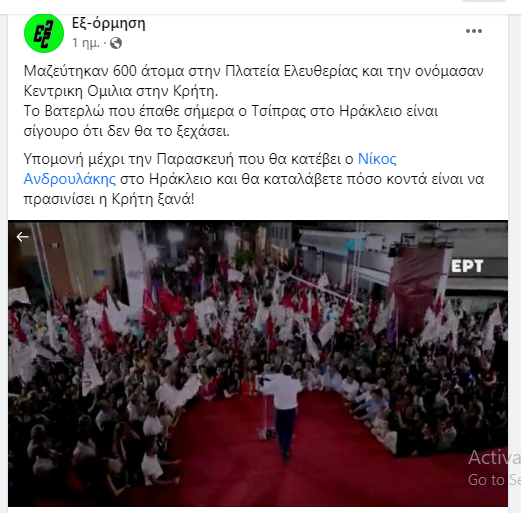 Για παράδειγμα, το (ανεπίσημο;) ΠΑΣΟΚ, μέσα από το όνομα της ιστορικής εφημερίδας “εξόρμηση” μας λέει ότι “είδε” 600 συγκεντρωμένους στην ομιλία Τσίπρα στην πλατεία Ελευθερίας και με οπαδικό στιλ μας είπε να περιμένουμε να δούμε τι θα γίνει την Παρασκευή στον ίδιο χώρο με Ανδρουλάκη!