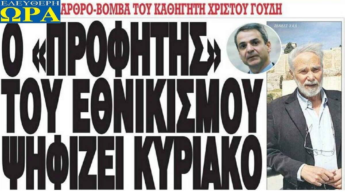 Ο Χρίστος Γούδης χαρακτηρίζεται από την «Ελεύθερη Ώρα»  ως ο «προφήτης» του εθνικισμού. Και δεν είναι τυχαίο ότι τη συγκεκριμένη εφημερίδα, που εκφράζει με καθαρότητα τον φιλοχουντικό – ακροδεξιό χώρο, επέλεξε για να διαφημίσει τη ΝΔ και να δώσει σύνθημα στους απανταχού εθνικιστές και φιλοχουντικούς ότι η μόνη επιλογή που έχουν στην κάλπη της 25ης Ιουνίου, είναι ο Μητσοτάκης.