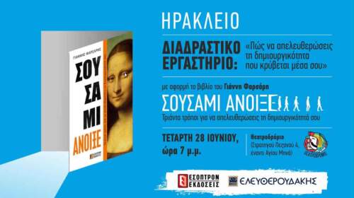 Το Βιβλιοπωλείο Ελευθερουδάκης Ηρακλείου και οι εκδόσεις Έσοπτρον, διοργανώνουν ένα διαδραστικό εργαστήριο με θέμα: «Πώς να απελευθερώσεις τη δημιουργικότητα που κρύβεται μέσα σου», με αφορμή το βιβλίο «Σουσάμι άνοιξε» του Γιάννη Φαρσάρη. ▶ Χώρος: ΘΕΑΤΡΟΔΡΟΜΙΟ (Στρατηγού Πεζανού 4, έναντι Αγίου Μηνά) ▶ Τετάρτη 28 Ιουνίου (ώρα 7:00-9:00 μ.μ.) ✩ Εισηγητής: Γιάννης Φαρσάρης, Συγγραφέας & Καθηγητής Πληροφορικής (✒ www.opensesame.gr) ▶ Χωρίς…