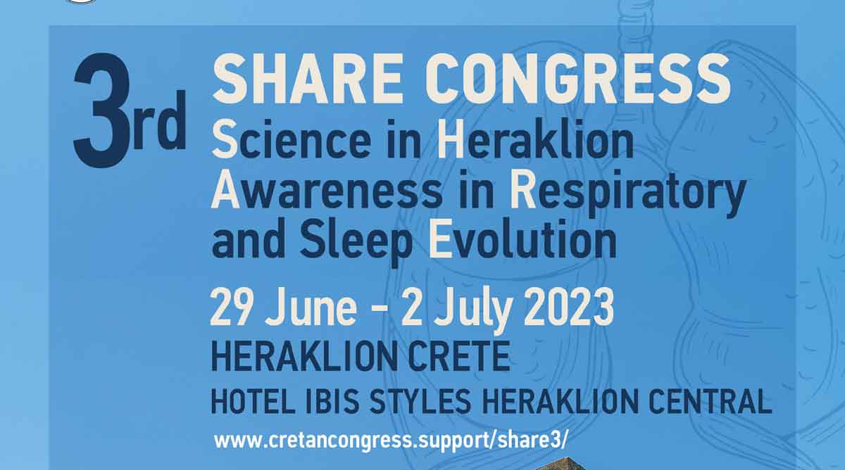 H Εταιρεία Πνευμονολογικής Έρευνας Πανεπιστημίου Κρήτης, σε συνεργασία με την Πανεπιστημιακή Πνευμονολογική Κλινική της Ιατρικής Σχολής Κρήτη, τη στήριξη της Περιφέρειας Κρήτης,  οργανώνει το 3rd SHARE Congress (Sciences in Heraklion Awareness in Respiratory and Sleep Evolution) με την επωνυμία SHARE από 29 Ιουνίου έως 2 Ιουλίου στο ξενοδοχείο Ibis style στο Ηράκλειο.