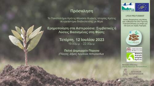 Παλιό Δημαρχείο Πύργου, Τετάρτη 12 Ιουλίου 2023 Το Πανεπιστήμιο Κρήτης-Μουσείο Φυσικής Ιστορίας Κρήτης, στο πλαίσιο υλοποίησης του προγράμματος LIFE20 PRE/IT/000007 – NewLIFE4Drylands* διοργανώνει εργαστήριο διαβούλευσης με τίτλο: «Ερημοποίηση στα Αστερούσια: Συμβατικές ή Λύσεις Βασισμένες στη Φύση;», την Τετάρτη, 12 Ιουλίου 2023. Η ημερίδα θα πραγματοποιηθεί στο Παλιό Δημαρχείου Πύργου, στον Πύργο του Δήμου Αρχανών Αστερουσίων, από τις 19.00 έως τις…