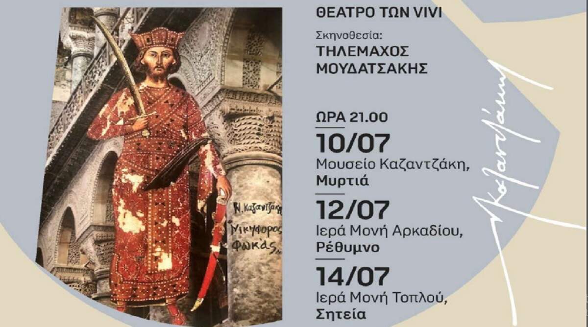 Η Αντιδημαρχία Πολιτισμού Δήμου Χερσονήσου σε συνδιοργάνωση με τον Πολιτιστικό και Λαογραφικό Σύλλογο Επισκοπής παρουσιάζουν την θεατρική παράσταση «Νικηφόρος Φωκάς» του Νίκου Καζαντζάκη με το Θέατρο των Vivi, το Σάββατο 15 Ιουλίου 2023 και ώρα 21.00 στην Επισκοπή, στο πάρκο Παναγιωτάκη.