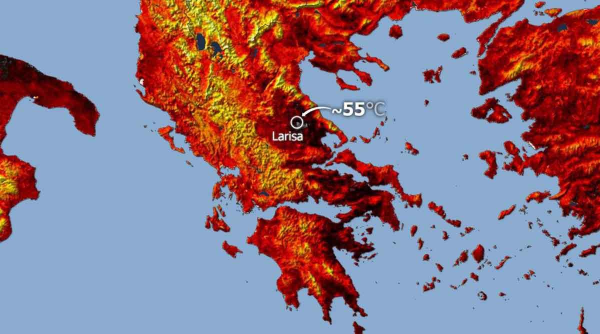 Τους 55 βαθμούς Κελσίου πλησίασε η θερμοκρασία εδάφους στον κάμπο της Θεσσαλίας, χθες Πέμπτη 13 Ιουλίου 2023, σύμφωνα με την επεξεργασία του climatebook.