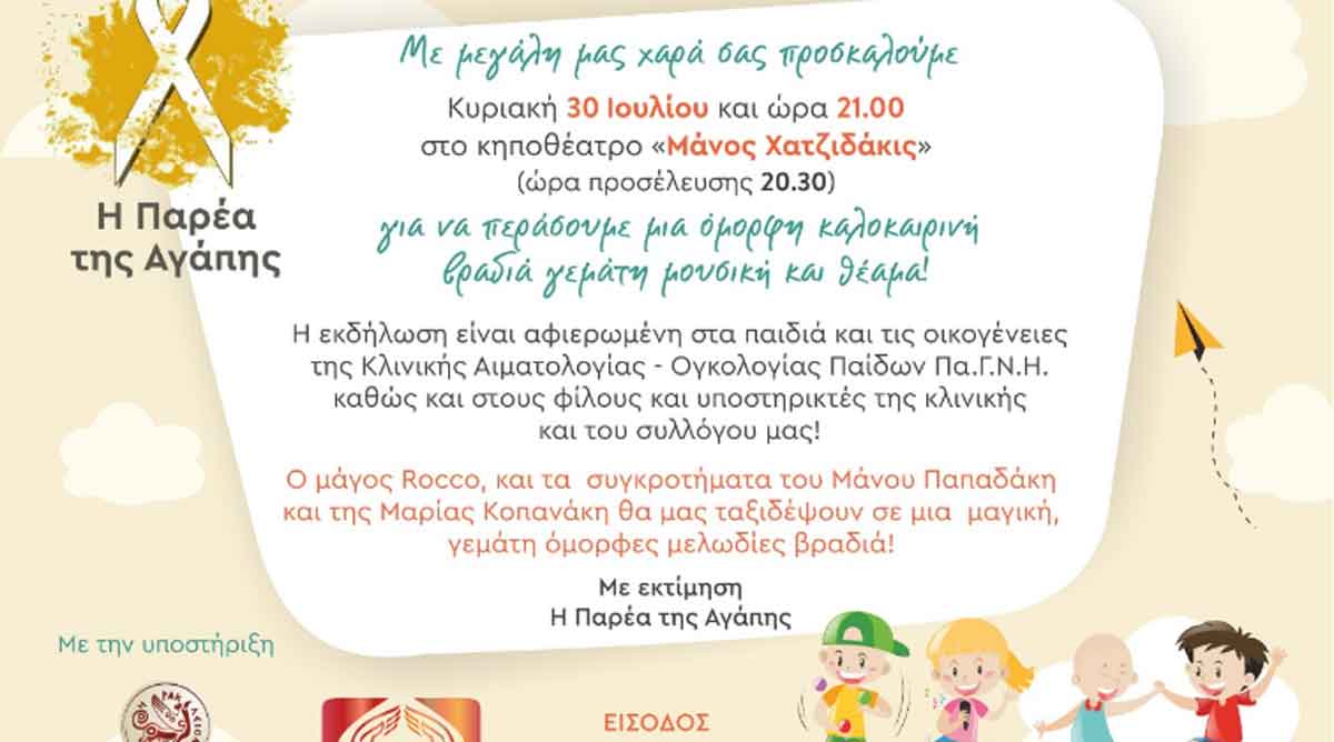 Ο μάγος Rocco, ο μουσικός Μάνος Παπαδάκης με το συγκρότημά του και η μουσικός Μαρία Κοπανάκη θα ψυχαγωγήσουν τα παιδιά και τις οικογένειές τους δίνοντας μια νότα χαράς και αισιοδοξίας και βοηθώντας με αυτόν τον τρόπο στον δύσκολο αγώνα που δίνουν καθημερινά.