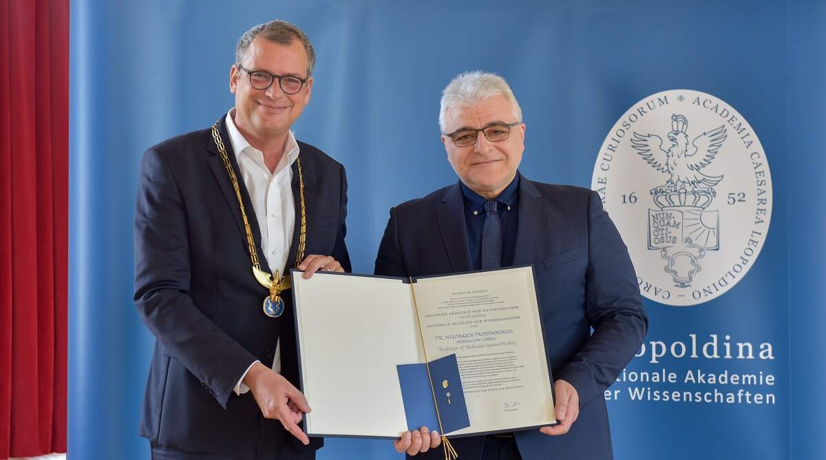 Μια ακόμα ιδιαίτερα τιμητική διεθνής διάκριση για τον καθ. Νεκτάριο Ταβερναράκη, έλαβε χώρα τον Ιούλιο στο Halle της Γερμανίας, όπου πραγματοποιήθηκε η τελετή εισδοχής του ως εκλεγμένου μέλους της Εθνικής Ακαδημίας Επιστημών της Γερμανίας Leopoldina (German National Academy of Sciences Leopoldina), στην τάξη των Νευροεπιστημών. Ο καθ. Ταβερναράκης είναι ο πρώτος Έλληνας που εκλέγεται μέλος της Leopoldina στον τομέα των βιοϊατρικών επιστημών, έχοντας διανύσει μια επιστημονική πορεία με ουσιαστική συμβολή στην κατανόηση των μηχανισμών νευροεκφυλισμού, μνήμης και μάθησης, καθώς και της γήρανσης. Η Εθνική Ακαδημία Επιστημών της Γερμανίας έχει ως στόχο την προώθηση της επιστημονικής και της κοινωνικής ανάπτυξης προς όφελος της ανθρωπότητας. Μέλη της είναι κορυφαίοι επιστήμονες, οι οποίοι χαίρουν διεθνούς αναγνώρισης για το επιστημονικό τους έργο και διακρίνονται για τη διεξαγωγή καινοτόμου και υψηλής στάθμης έρευνας. H Ακαδημία αριθμεί περί τα 1.600 μέλη, εκ των οποίων τα 187 έχουν τιμηθεί με το βραβείο Νόμπελ.