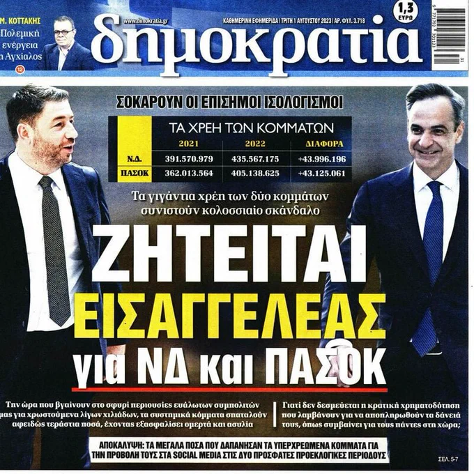 Να σημειωθεί ότι η εφημερίδα «δημοκρατία» με σημερινό της πρωτοσέλιδο θέμα και τίτλο «Ζητείται εισαγγελέας για ΝΔ και ΠΑΣΟΚ», κάνει λόγο για κολοσσιαίο σκάνδαλο.
