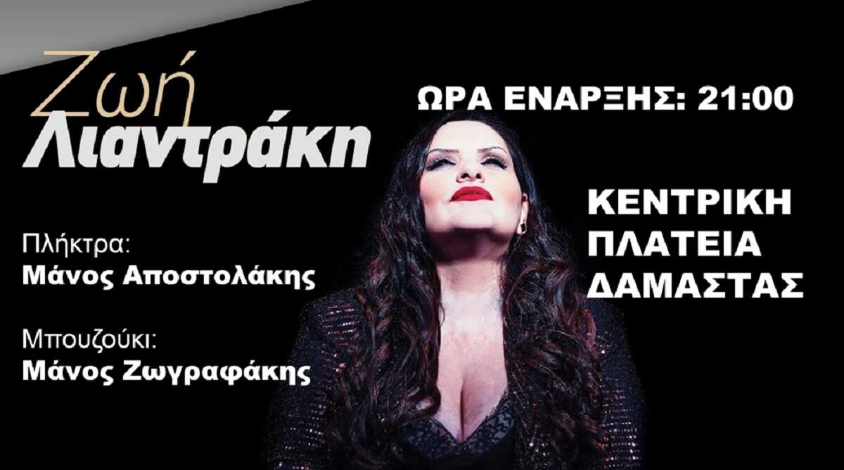 Το Σάββατο 12 Αυγούστου 2023 και ώρα 9.00 μ.μ., στην κεντρική πλατεία Δαμάστας, θα πραγματοποιηθεί μουσική συναυλία με την Ζωή Λιαντράκη. Στα πλήκτρα ο Μάνος Αποστολάκης και στο μπουζούκι ο Μάνος Ζωγραφάκης.