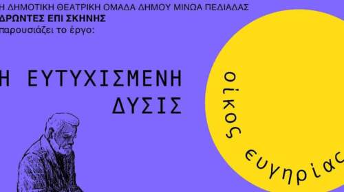 Η ΘΕΑΤΡΙΚΗ ΠΑΡΑΣΤΑΣΗ «Οίκος Ευγηρίας – Η Ευτυχισμένη Δύσις» Του Μανώλη Κορρέ σε σκηνοθεσία Ευαγγελίας Μαρκοπούλου, από την ομάδα «Δρώντες επί σκηνής» στο Κηποθέατρο «Ν. Καζαντζάκης» την Κυριακή 13 Αυγούστου στις 21:30 Είσοδος Ελεύθερη Η Δημοτική Θεατρική Ομάδα Μινώα Πεδιάδας «Δρώντες επί σκηνής» συνεχίζει την επιτυχημένη πορεία της και παρουσιάζει φέτος το έργο: «Οίκος Ευγηρίας – Η Ευτυχισμένη Δύσις» του…