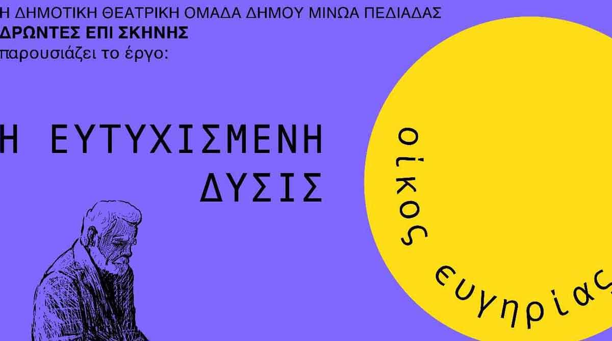 Η Δημοτική Θεατρική Ομάδα Μινώα Πεδιάδας «Δρώντες επί σκηνής» συνεχίζει την επιτυχημένη πορεία της και παρουσιάζει φέτος το έργο: «Οίκος Ευγηρίας – Η Ευτυχισμένη Δύσις» του Μανώλη Κορρέ, σε σκηνοθεσία Ευαγγελίας Μαρκοπούλου.
