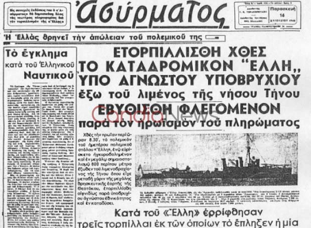Ήταν ανήμερα του Δεκαπενταύγουστου, το 1940. Στην Τήνο γιορταζόταν με λαμπρότητα το Πάσχα του καλοκαιριού. Πλήθος κόσμου ήταν στην προκυμαία αναμένοντας τη λιτάνευση της ιερής εικόνας της Κοιμήσεως της Θεοτόκου. Έξω από το λιμάνι βρισκόταν και το ελαφρύ καταδρομικό του ελληνικού πολεμικού ναυτικού «Έλλη», συμμετέχοντας στο γιορτασμό της ημέρας. Περίπου στις 8.30 το πρωί ένα υποβρύχιο, που βρισκόταν σε κατάδυση, εξαπολύει τρεις τορπίλες κατά του ελληνικού πλοίου, απ’ τις οποίες η μία πέτυχε το στόχο και οι άλλες δύο εξερράγησαν στην προκυμαία του λιμανιού. Μετά από μια ώρα περίπου η «Έλλη» βυθιζόταν. Από την ύπουλη επίθεση βρήκαν το θάνατο 9 ναύτες και άλλοι 24 τραυματίστηκαν. Ήταν στην ουσία οι πρώτοι Έλληνες νεκροί του Β΄ Παγκοσμίου Πολέμου.