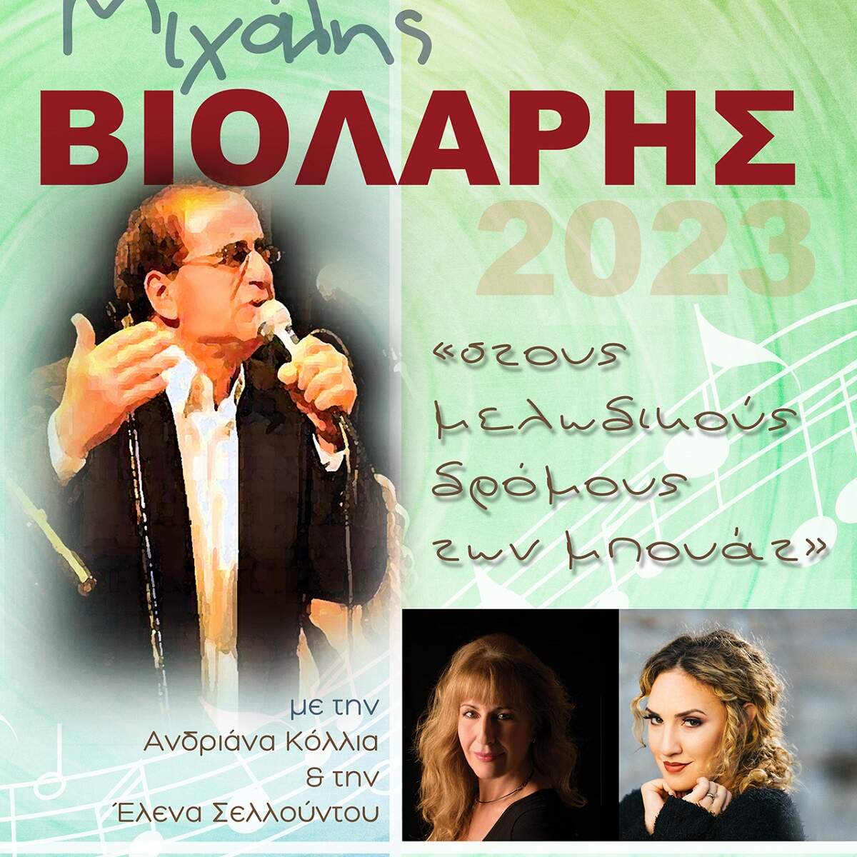 Την Τρίτη 22 Αυγούστου 2023 και ώρα 9.15 μ.μ., στο Κηποθέατρο «Μάνος Χατζιδάκις» στο Ηράκλειο, θα πραγματοποιηθεί μουσική συναυλία με τον Μιχάλη Βιολάρη με τίτλο «στους μελωδικούς δρόμους των μπουάτ» . Μαζί του στο τραγούδι θα είναι η Ανδριάννα Κόλλια και η Έλενα Σελλούντου ενώ θα τον συνοδεύσουν οι μουσικοί: Γιώργος Σαλβάνος: Πιάνο, ενορχηστρώσεις, Δημήτρης Παπαγγελίδης: Κλασσική Κιθάρα, Μαριλίζα Παπαγγελίδη: Βιολοντζέλο, Μιχάλης Γιατράκης: Μπουζούκι, Μαρία Γιατράκη: Μπουζούκι, Γιώργος Πολίτης: Μπάσο. Πρόκειται για μια διοργάνωση της Περιφέρειας Κρήτης με την υποστήριξη του Δήμου Ηρακλείου και της ΔΗΚΕΗ με ελεύθερη είσοδο για τους πολίτες