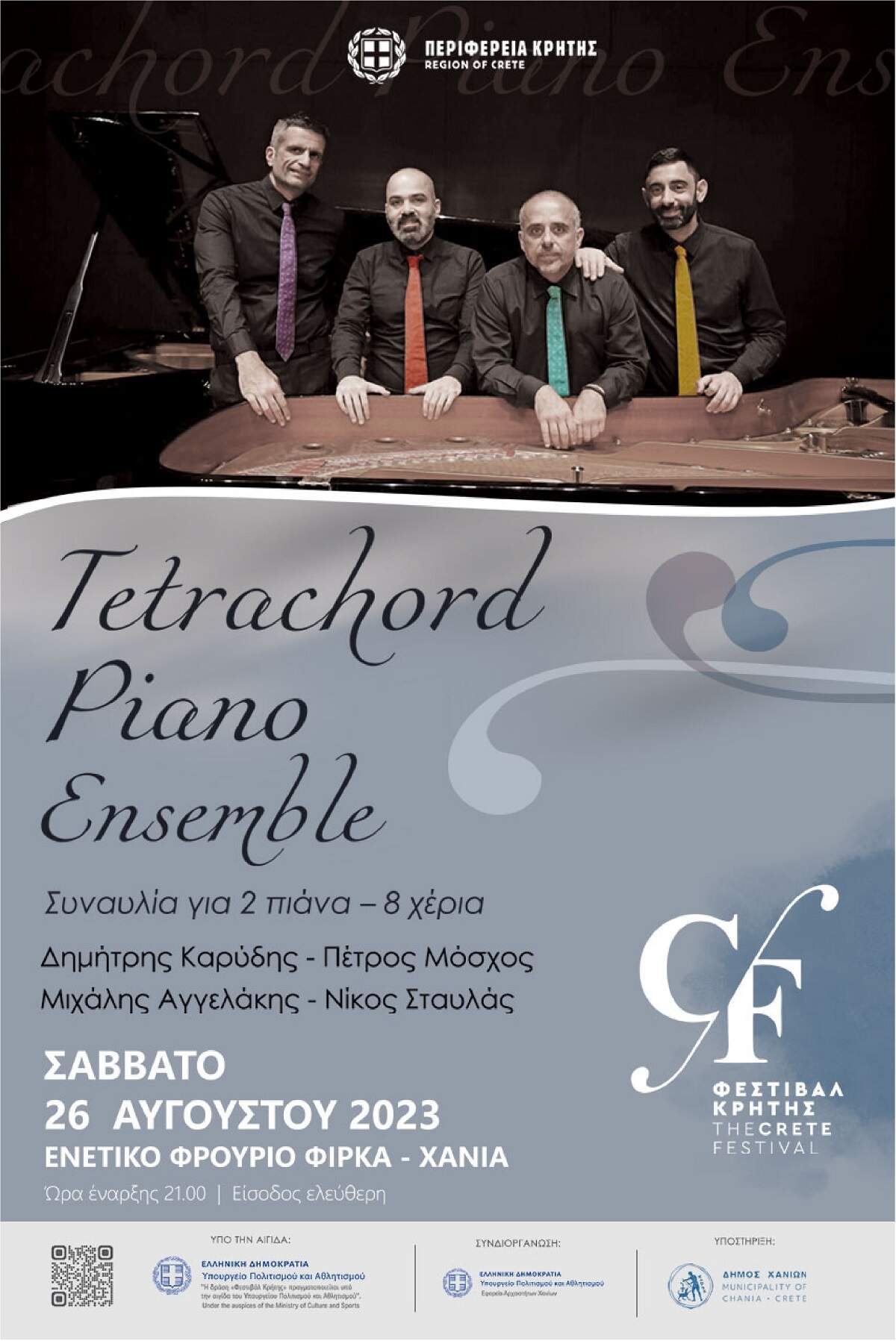 Στο πλαίσιο του «Φεστιβάλ Κρήτης», που διοργανώνει η Περιφέρεια Κρήτης, για τρίτη χρονιά φέτος, υπό την αιγίδα του υπουργείου Πολιτισμού, θα παρουσιαστεί μια συναυλία για 2 πιάνα – 8 χέρια από το “Tetrachord Piano Ensemble” στο Ενετικό φρούριο Φιρκά. Η ώρα έναρξης είναι 21:00 και η είσοδος ελεύθερη στους πολίτες.