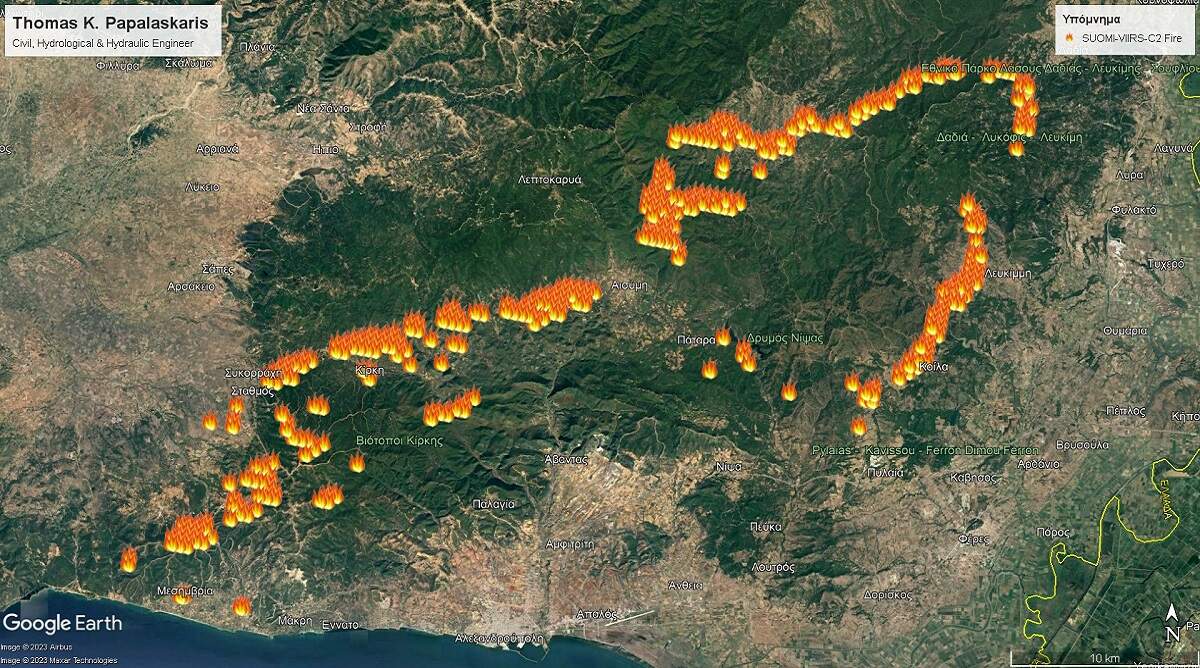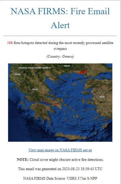 Καβαλιώτης «Πολιτικός Μηχανικός» εντόπισε, με την βοήθεια της χρήσης δορυφορικών δεδομένων και γεωγραφικών πληροφοριακών συστημάτων, «τριακόσια εβδομήντα τέσσερα» («374») εστίες φωτιάς/θερμά σημεία, σε «κοντινό πραγματικό χρόνο» («near real time»), στην “Β.Α.”, “Β” και “Β.Δ.” πλευρά της «Αλεξανδρούπολης», του «Δήμου Αλεξανδρούπολης», του «Νομού Έβρου», με αφίξεις ειδοποίησης, (με συνημμένο αρχείο τύπου «Google Earth»), στο προσωπικό του «e-mail», στις «21:59:43» («Ώρα Ελλάδας»), (μετά το μεσημέρι), («Τετάρτη 23 Αυγούστου 2023»), σε συγκεκριμένες θέσεις με γνωστοποιημένες τις γεωγραφικές συντεταγμένες των προαναφερθέντων σημείων οι οποίες για προφανείς λόγους οικονομίας χώρου δεν είναι δυνατόν να αναφερθούν στο συγκεκριμένο παρόν άρθρο, ενώ ενδεικτικά αναφέρονται τα συγκεκριμένα χαρακτηριστικά σημεία: 1).«Γεωγραφικό Πλάτος: 40.860000° / Γεωγραφικό Μήκος: 25.753710°» (ακραίο νοτιοδυτικό σημείο κοντά στην «Νέα Μάκρη»), 2).«Γεωγραφικό Πλάτος: 41.109400° / Γεωγραφικό Μήκος: 26.151550°» (ακραίο βορειοδυτικό σημείο, νότια του «Χώρου Αναψυχής Κατρατζήδων»), 3).«Γεωγραφικό Πλάτος: 41.111180° / Γεωγραφικό Μήκος: 26.198470°» (ακραίο βορειοανατολικό σημείο, νοτιοδυτικά της «Δαδιάς»), και 4).«Γεωγραφικό Πλάτος: 40.934410° / Γεωγραφικό Μήκος: 26.084960°» (ακραίο νοτιοανατολικό σημείο, βορειοδυτικά της «Πυλαίας»), από το σύστημα «SUOMI-VIIRS-C2 Fire», έπειτα από εγγραφή στην διαδικτυακή πλατφόρμα «Fire Information for Resource Management System», (εν συντομία «FIRMS») του συστήματος «Nasa/Earthdata» [1]..