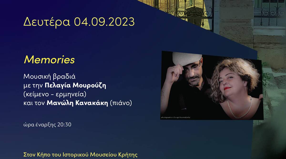 Υποδεχόμαστε τον Σεπτέμβριο στον Κήπο του Ιστορικού Μουσείου Κρήτης με τη μουσική παράσταση “Memories”. Τη Δευτέρα 4 Σεπτεμβρίου, στις 20:30, η Πελαγία Μουρούζη στα κείμενα και την ερμηνεία και ο Μανώλης Κανακάκης στο πιάνο θα μας οδηγήσουν σε ένα μουσικό ταξίδι αναμνήσεων. Τραγούδια που σμίγουν με ιστορίες και ιστορίες που έγιναν τραγούδια, από την Ελλάδα και τα σοκάκια της Πλάκας ως τη Νέα Υόρκη και το Central Park.