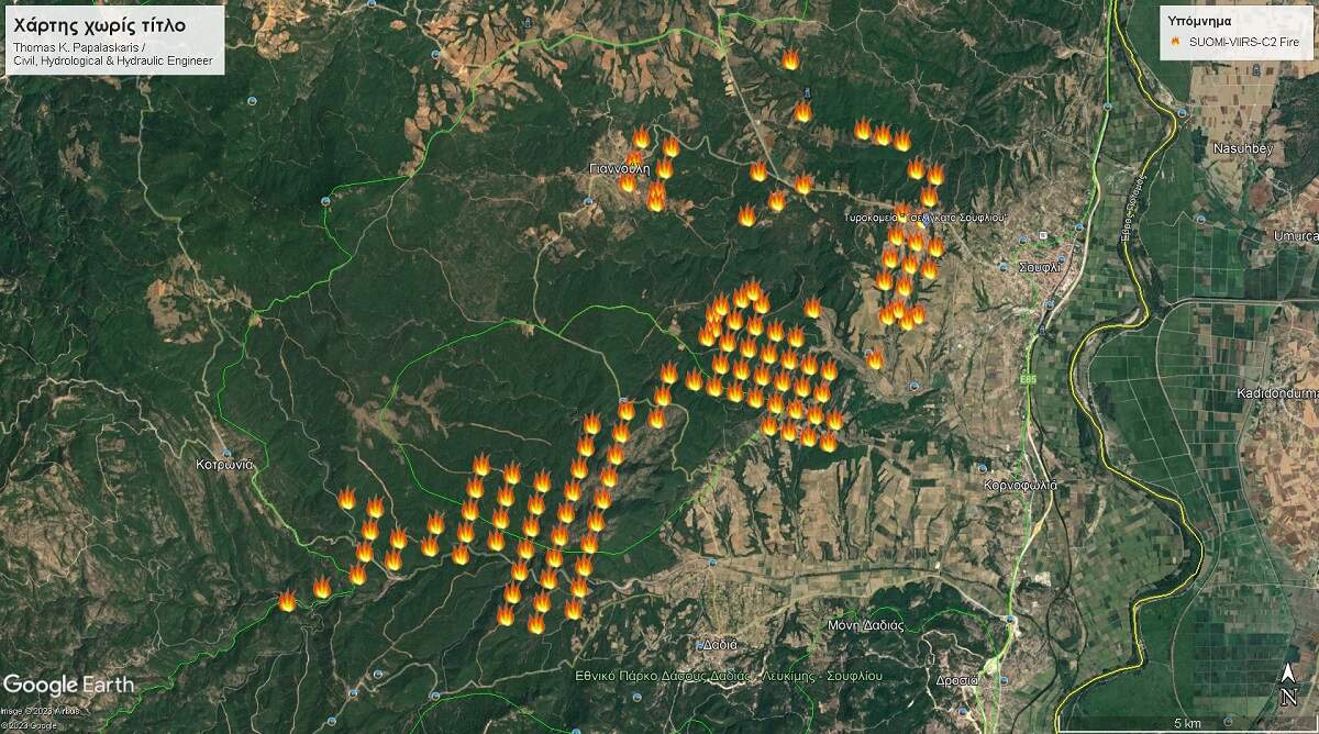 Καβαλιώτης «Πολιτικός Μηχανικός» εντόπισε, με την βοήθεια της χρήσης δορυφορικών δεδομένων και γεωγραφικών πληροφοριακών συστημάτων, «εκατόν είκοσι» («120») εστίες φωτιάς/θερμά σημεία, σε «κοντινό πραγματικό χρόνο» («near real time»), στην “Β.Δ.”, “Δ.” και “Ν.Δ.” πλευρά του «Σουφλίου», του «Δήμου Σουφλίου», του «Νομού Έβρου», με αφίξεις ειδοποίησης, (με συνημμένο αρχείο τύπου «Google Earth»), στο προσωπικό του «e-mail», στις «08:06:18_π.μ.» («Ώρα Ελλάδας»), (πριν το μεσημέρι), («Παρασκευή 01 Σεπτέμβρη 2023»), σε συγκεκριμένες θέσεις με γνωστοποιημένες τις γεωγραφικές συντεταγμένες των προαναφερθέντων σημείων οι οποίες για προφανείς λόγους οικονομίας χώρου δεν είναι δυνατόν να αναφερθούν στο συγκεκριμένο παρόν άρθρο, ενώ ενδεικτικά αναφέρονται τα συγκεκριμένα χαρακτηριστικά σημεία: 1).«Γεωγραφικό Πλάτος: 41.136060° / Γεωγραφικό Μήκος: 26.127320°» (ακραίο νοτιοδυτικό σημείο κοντά στην «Κοτρωνιά Έβρου»), 2).«Γεωγραφικό Πλάτος: 41.230880° / Γεωγραφικό Μήκος: 26.242030°» (ακραίο βορειοδυτικό σημείο, στην «Γιαννούλη Έβρου»), 3).«Γεωγραφικό Πλάτος: 41.210960° / Γεωγραφικό Μήκος: 26.275450°» (ακραίο βορειοανατολικό σημείο, βορειοδυτικά της παρυφής/περιμέτρου του «Σουφλίου Έβρου»), και 4).«Γεωγραφικό Πλάτος: 41.164010° / Γεωγραφικό Μήκος: 26.250790°» (ακραίο νοτιοανατολικό σημείο, βορειοδυτικά της «Κορνοφωλιάς Έβρου»), από το σύστημα «SUOMI-VIIRS-C2 Fire», έπειτα από εγγραφή στην διαδικτυακή πλατφόρμα «Fire Information for Resource Management System», (εν συντομία «FIRMS») του συστήματος «Nasa/Earthdata» [1]..