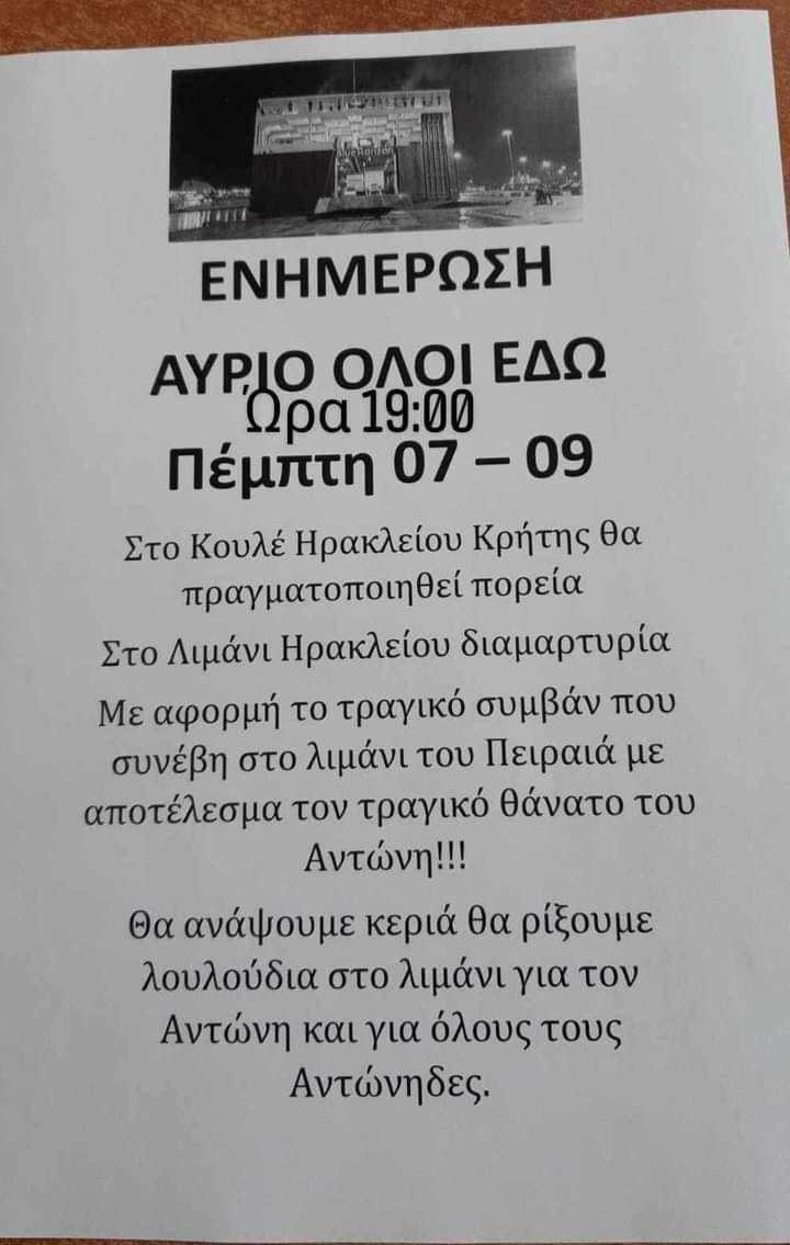 Νέα συγκέντρωση και πορεία για τον δολοφονημένο Αντώνη Καρυώτη πραγματοποιείται σήμερα στο Ηράκλειο. Το ραντεβού είαι για τις 7 το απόγευμα στον Κούλε και στη συνέχεια πορεία μέχρι το λιμάνι του Ηρακλείου, όπου οι συγκεντρωμένοι θα ανάψουν κεριά και θα πετάξουν λουλούδια στη θάλασσα.