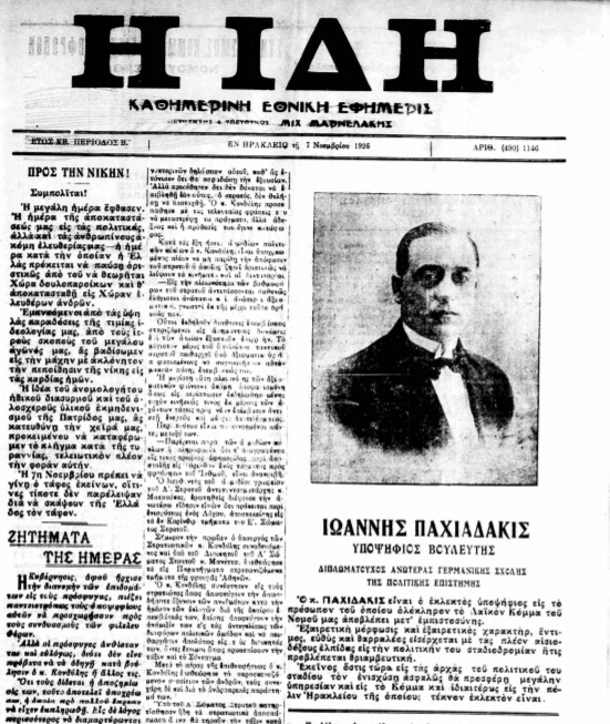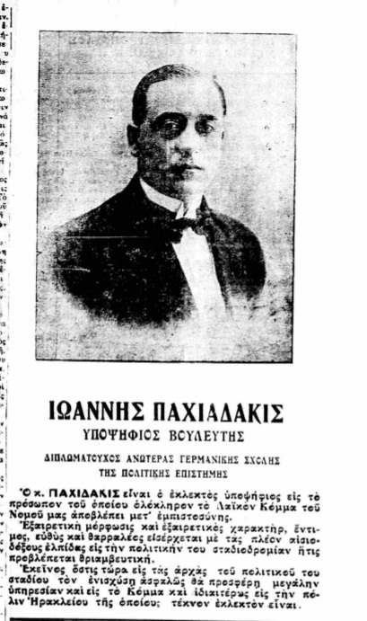 Ο Πασσαδάκης, όταν ακόμη ονομαζόταν Παχιαδάκης, σε φωτογραφία ως υποψήφιος βουλευτής του Λαϊκού Κόμματος στο Ηράκλειο, την οποία είχε δημοσιεύσει η τοπική εφημερίδα “Ίδη” στις 7 Νοεμβρίου 1926