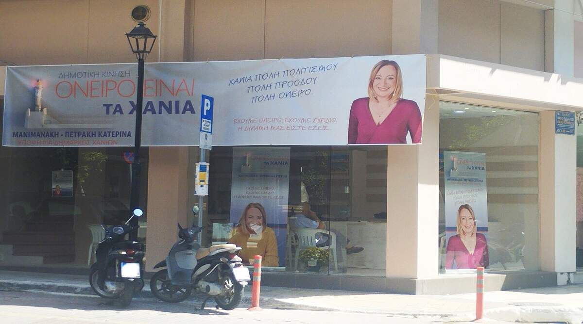 Θα είναι τα γραφεία μας όπου θα μας βρει κάθε πολίτης, προς το παρόν από τις 9 το πρωί έως τη 1.30 το μεσημέρι και από τις 6 έως τις 9 το βράδυ. Θα είναι το ορμητήριο για κάθε περιοδεία μας. Θα είναι το στέκι μας για καφέ και τσικουδιά, για ανθρώπινη συναναστροφή. Πάνω από όλα θα είναι το μέρος όπου θα συνεχίζουμε να σχεδιάζουμε μαζί μια βιώσιμη πόλη. Στη γωνία Μιχελιδάκη και Παπανδρέου η υποψήφια δήμαρχος Κατερίνα Μανιμανάκη-Πετράκη περιμένει κάθε Χανιώτη και Χανιώτισσα για ιδέες, κριτική και συζήτηση. Τα γραφεία της κίνησης «Όνειρο είναι τα Χανιά» θα είναι ανοιχτά και το τηλέφωνό μας είναι 28210 5955