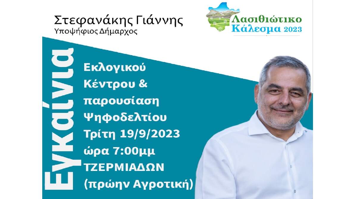 Σήμερα Τρίτη 19 Σεπτεμβρίου 2023 το απόγευμα στις 7:00μμ τα εγκαίνια του εκλογικού κέντρου του συνδυασμού “ΛΑΣΙΘΙΩΤΙΚΟ ΚΑΛΕΣΜΑ 2023” και η παρουσίαση των υποψηφίων, στο Τζερμιάδων Οροπεδίου Λασιθίου (πρώην τράπεζα Πειραιώς – Αγροτική).