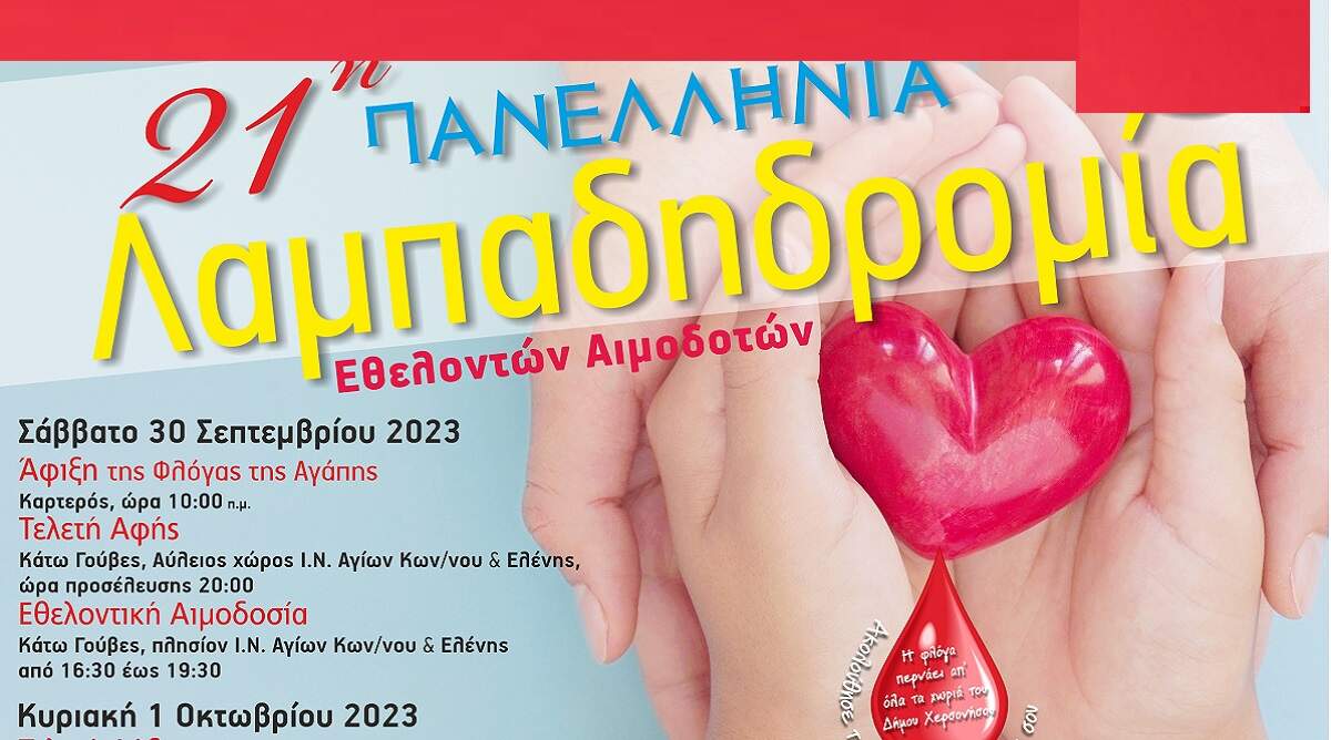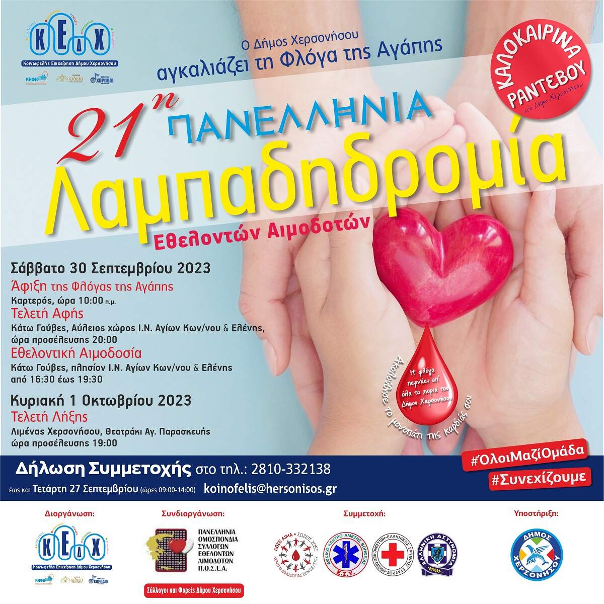 Η Κοινωφελής Επιχείρηση Δήμου Χερσονήσου (Κ.Ε.Δ.Χ.) στο πλαίσιο των εκδηλώσεων «Καλοκαιρινά Ραντεβού στον Δήμο Χερσονήσου 2023» διοργανώνει την 21η Πανελλήνια Λαμπαδηδρομία Εθελοντών Αιμοδοτών μαζί με την Πανελλήνια Ομοσπονδία Συλλόγων Εθελοντών Αιμοδοτών (Π.Ο.Σ.Ε.Α.), συλλόγους και φορείς, με την υποστήριξη του Δήμου Χερσονήσου. Επίσης, συμμετέχουν: Κέντρο Αιμοδοσίας Βενιζέλειου Νοσοκομείου Ηρακλείου, Εθνικό Κέντρο Άμεσης Βοήθειας (ΕΚΑΒ) Ηρακλείου, Περιφερειακό Τμήμα Ελληνικού Ερυθρού Σταυρού Ηρακλείου και το Αστυνομικό Τμήμα Χερσονήσου.