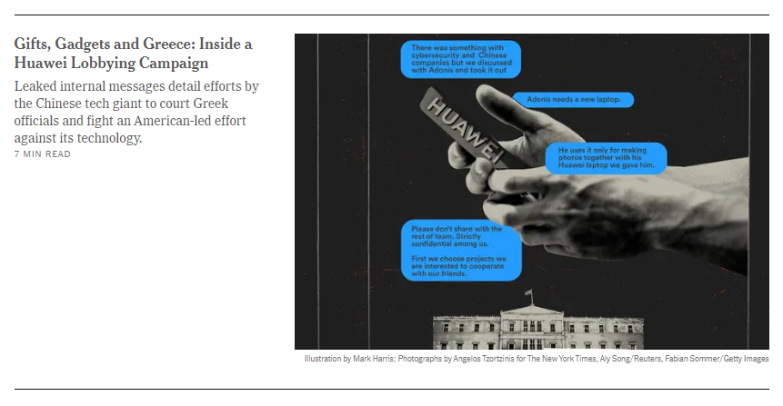 «Δώρα, Gadgets και Ελλάδα: Μία ματιά στην καμπάνια Lobbying της Huawei» είναι ο τίτλος του δημοσιεύματος των New York Times που εμπλέκουν τον Άδωνη Γεωργιάδη σε υπόθεση διαφθοράς. Πρόκειται για το δημοσίευμα που είχαν προαναγγείλει «Τα Νέα», προκαλώντας αίσθηση καθώς ήταν περίεργη η σπουδή να απαντήσουν στους New York Times πριν ακόμα η έγκυρη αμερικανική εφημερίδα δημοσιεύσει την έρευνά της. Αξίζει να σημειωθεί ότι το ρεπορτάζ των New York Times βρίσκεται στην κεντρική σελίδα της ιστοσελίδας του της αμερικανικής εφημερίδας.