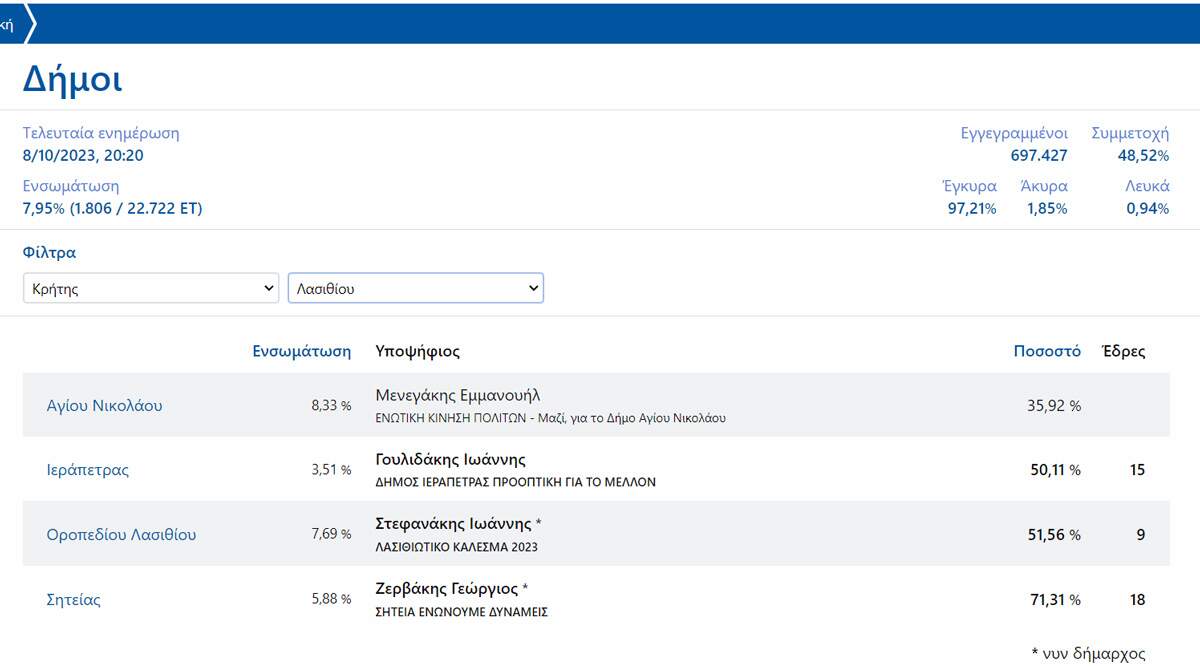 Τα πρώτα αποτελέσματα στους Δήμους Λασιθίου