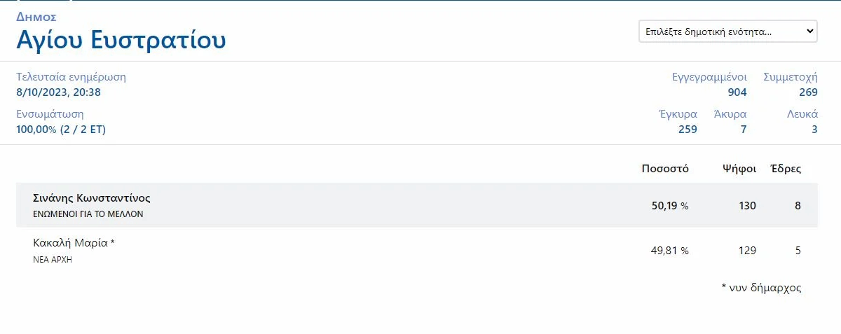Συγκεκριμένα, όπως φαίνεται στα αποτελέσματα του υπουργείου Εσωτερικών, στο 100% της ενσωμάτωσης, ο κ. Σινάνης πήρε ποσοστό 50,19% και 130 ψήφους, ενώ η κυρία Κακαλή 49,81% και 129 ψήφους.