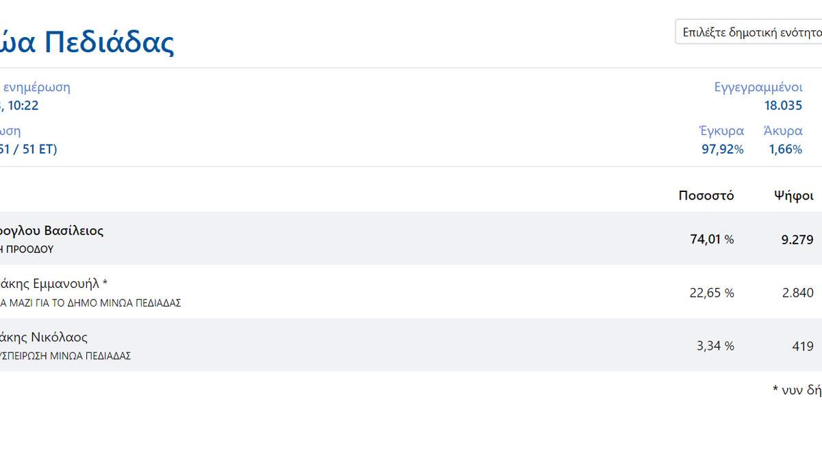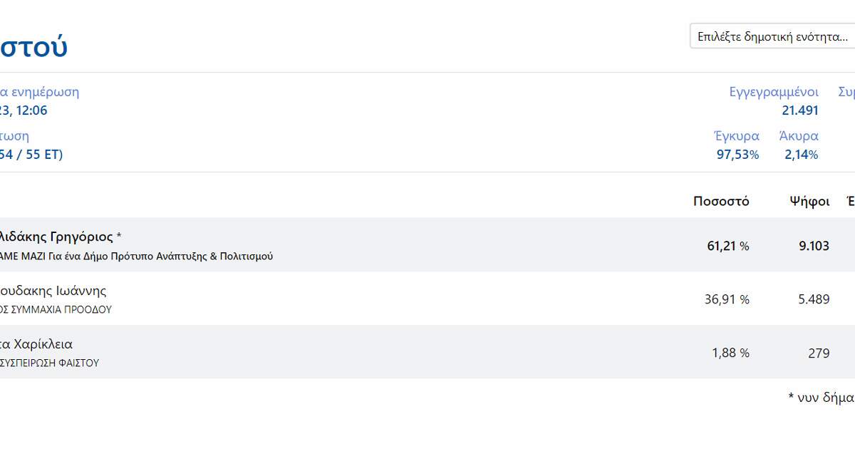 Από την πρώτη Κυριακή εξελέγησαν δήμαρχοι στους 7 από τους 8 δήμους της Π.Ε. Ηρακλείου, ανάμεσά τους και το Ηράκλειο, όπου νέος δήμαρχις της Λότζια αναδείχθηκε με 47,15% ο Αλέξης Καλοκαιρινός. Στο δήμο Χερσονήσου όλα θα κριθούν την ερχόμενη Κυριακή, ανάμεσα στον έχοντα το αριθμητικό από τον πρώτο γύρο προβάδισμα Ζαχαρία Δοξαστάκη και τον νυν δήμαρχο Γιάννη Σέγκο.