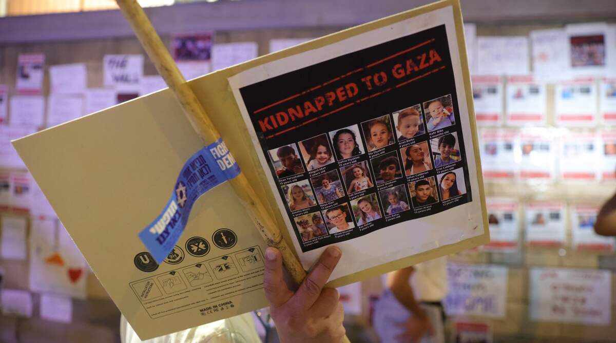 epa10919215 A person holds a sign with pictures of hostages during a protest calling on the Israeli government to help rescue the hostages held by Hamas militants in Gaza, outside the Kirya military base in Tel Aviv, Israel, 14 October 2023. More than 1,300 Israelis have been killed and over 3,200 others injured, according to the IDF, after the Islamist movement Hamas launched an attack against Israel from the Gaza Strip on 07 October. More than 2,000 Palestinians have been killed and over 8,700 others injured in Gaza since Israel launched retaliatory air strikes, the Palestinian health ministry said. EPA/ABIR SULTAN