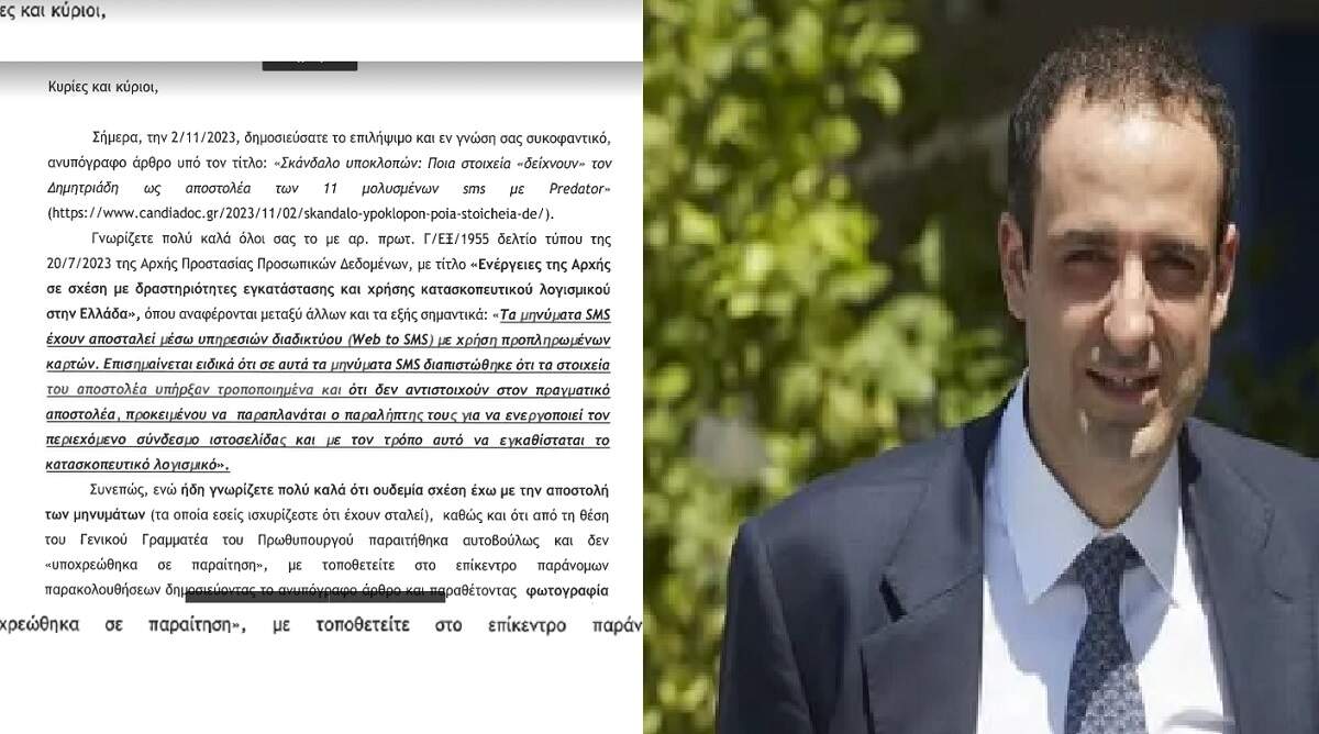Με εξώδικο στο Candiadoc, “απάντησε ο Γρηγόρης Δημητριάδης στην ανάρτηση του site για τις πληροφορίες που αναγράφονται στις τελευταίες ώρες και τον ονομάζουν ή περιγράφουν “ως αποστολέα των 11 μολυσμένων sms με Predator”.